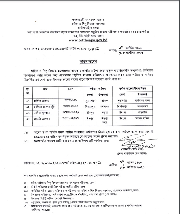 | ২ | তথ্য আপা প্রকল্প 2য় পর্যায়-এ লাবনী আক্তার, তথ্যসেবা সহকারী , তথ্যকেন্দ্র চাঁদপুর সদর এর কর্মস্থল বদলিজনিত অফিস আদেশ। | | ০২-১১-২০২৩ | দেখুন |